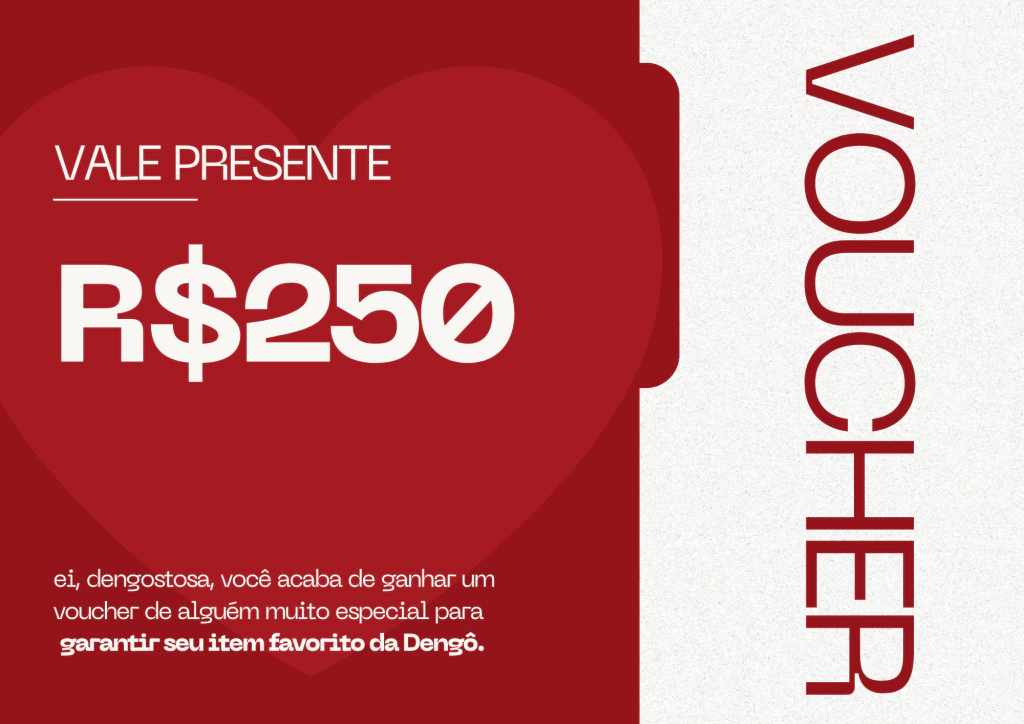 Ta cansadx de não dar ou receber o presente ideal? Com o nosso gift card de Dia dos Namorados, você escolhe o valor e nós enviamos uma mensagem pro seu WhatsApp ou o para o da pessoa a ser presenteada com um voucher, assim ela fica livre pra escolher o dengô que mais combinar com ela :) é só colocar nas observações do pedido o numero de contato da dengostosa sortuda.